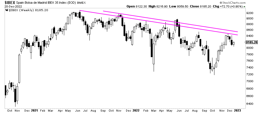 No es casualidad que el Ibex 35 empiece a "amenazar" la directriz bajista que muestra y que podría confirmar un nuevo mercado alcista en ese índice.