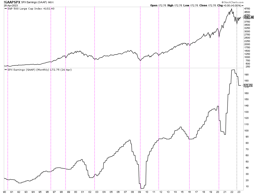 De nuevo, esto es así porque las cotizaciones del mercado son un descuento de las expectativas futuras, no un reflejo de los beneficios ya pasados. Caso paradigmático es el de la recesión de 1990 y años posteriores.