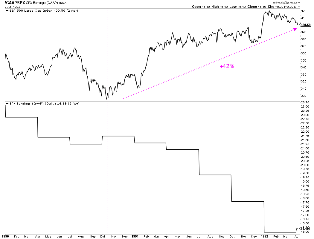 En la recesión de aquel año las cotizaciones empezaron a declinar, junto con los beneficios corporativos. Sin embargo, el mercado haría suelo en octubre de 1990 apreciándose un 42% en año y medio, mientras los queridos beneficios empresariales siguieron declinando durante todo ese periodo.