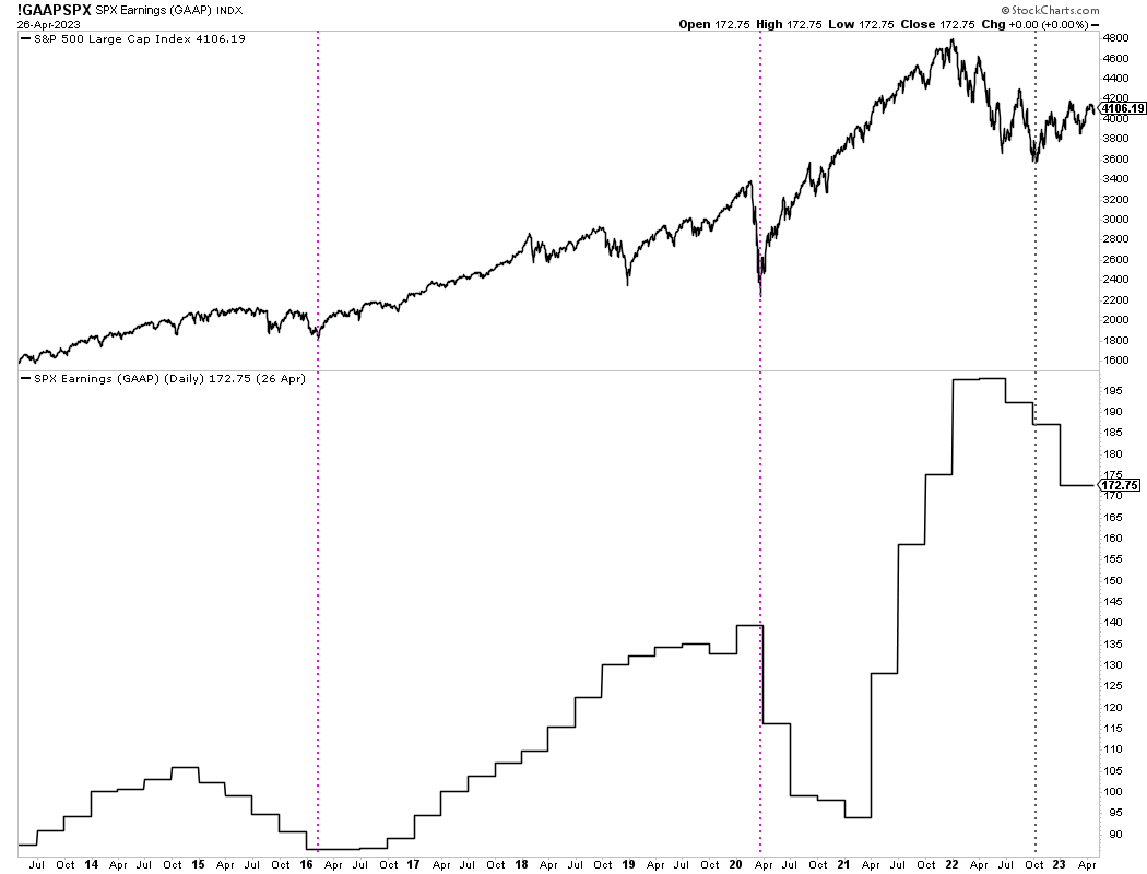 Si observamos la década más reciente, la observación es la misma. El mercado hizo suelo en febrero de 2016, pero el ciclo de beneficios no comenzó a mejorar hasta 2 trimestres después. El el siguiendo ciclo el mercado hizo suelo en marzo de 2020, durante la pandemia, mientras que los beneficios siguieron declinando hasta 4 trimestres más.