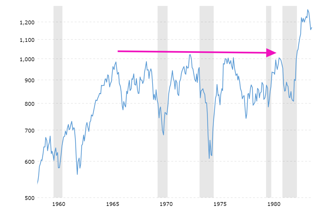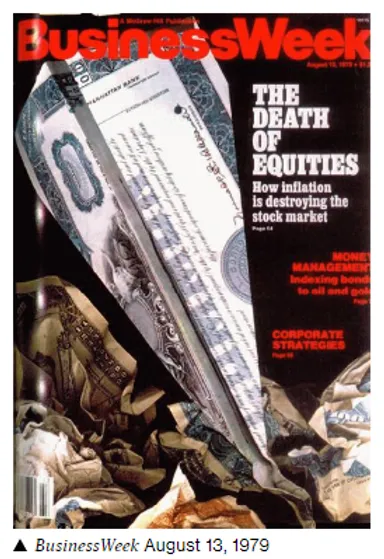 Después de esa desastrosa década, los medios se hacían eco de las malas condiciones por las que pasaban las bolsas y famosa es la portada de la revista BusinessWeek (hoy en día Bloomberg BusinessWeek), que declaró "la muerte" de las acciones. Básicamente ese fue el fin del mercado bajista secular (lateral de largo plazo) antes de dos décadas extraordinarias para el mercado de valores (1980-2000).