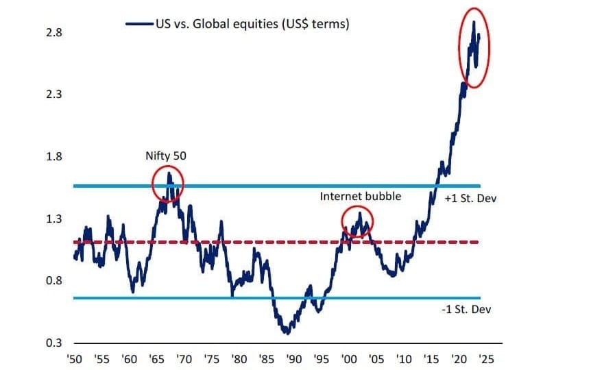 Con esto quiero decir que las grandes décadas en bolsa a largo plazo comienzan con un extremo pesimismo, mientras que las peores décadas en bolsa comienzan con una fuerte euforia. Y ahora estamos en el segundo caso. O lo estamos desde 2021.