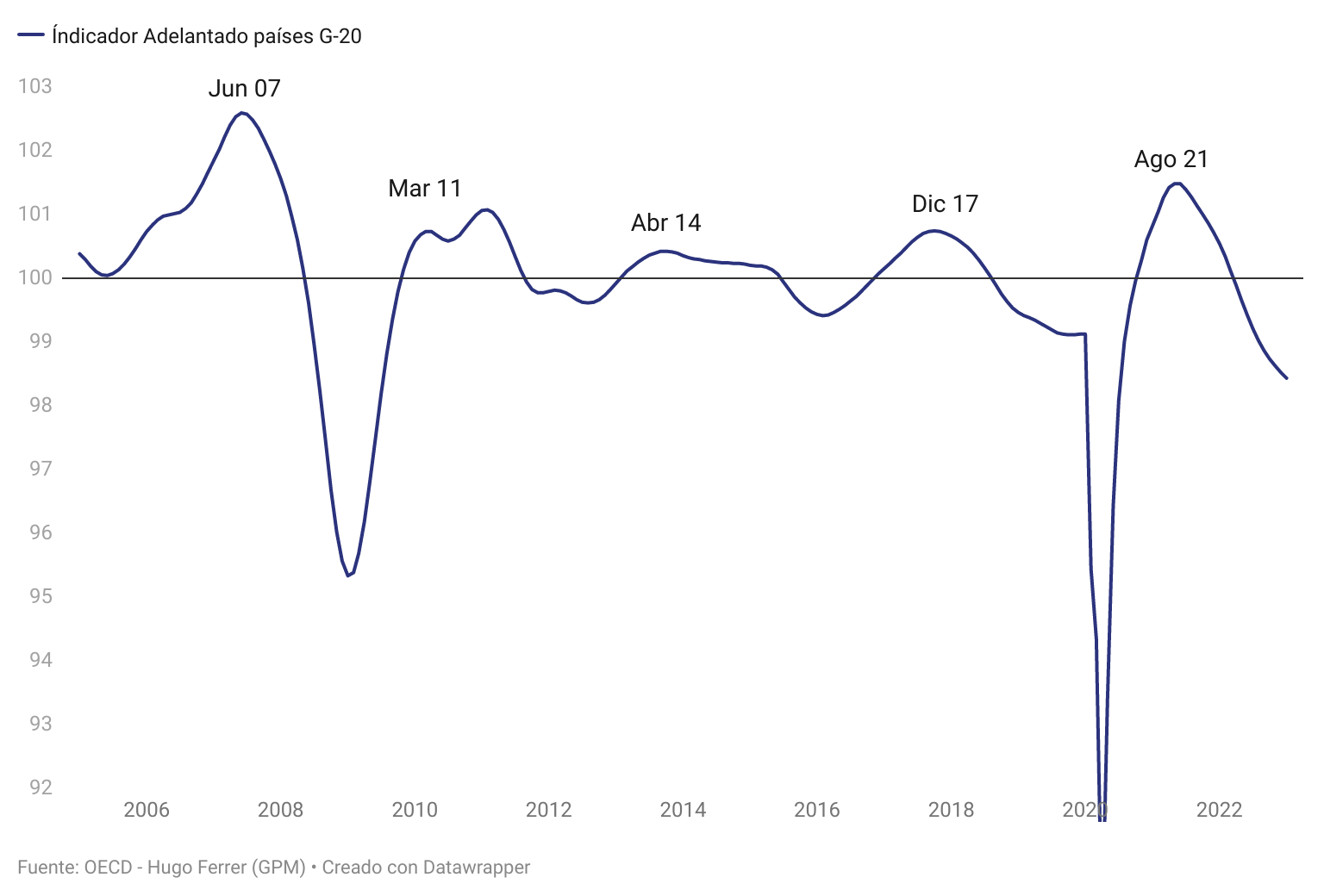 Uno es el indicador adelantado de la OCDE sobre el conjunto de países que conforman el G-20, grupo que representa el 90% del producto nacional bruto mundial y el 80% del comercio global. Es decir, el indicator líder del G-20 representa lo que está ocurriendo en el mundo.