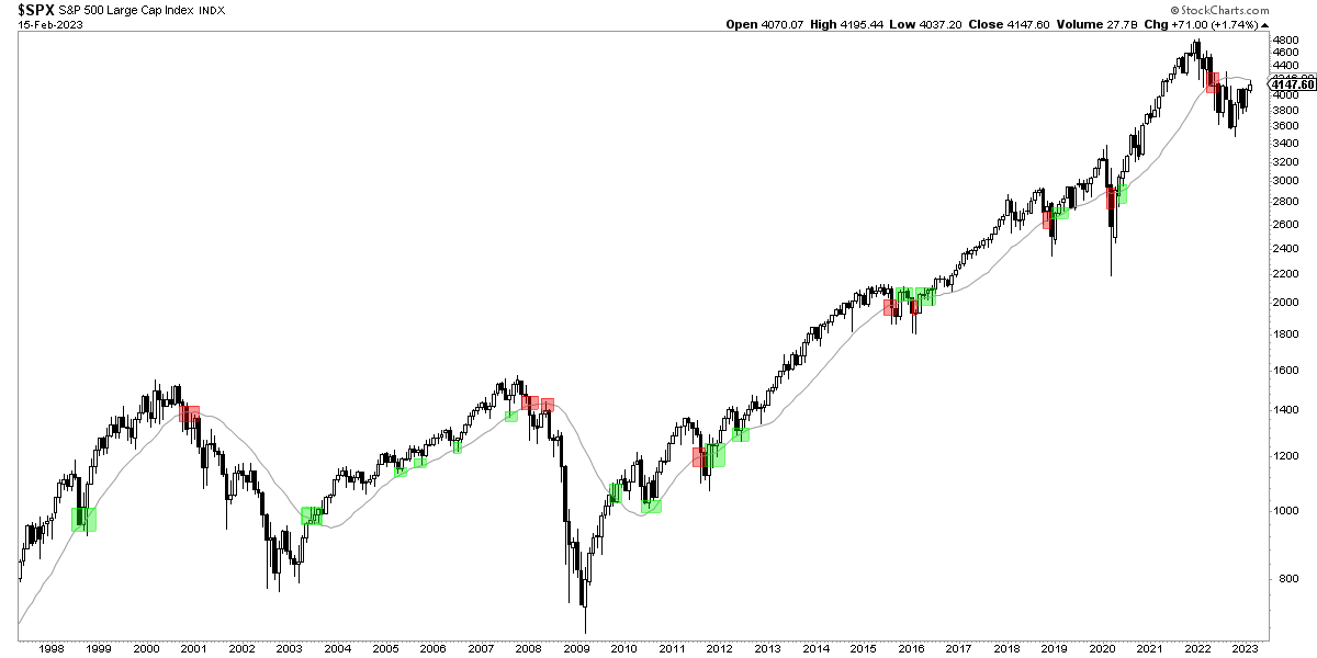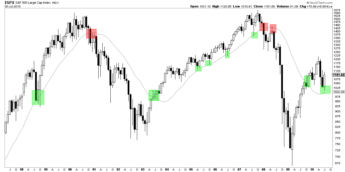 Lo interesante de esta media es que suele definir muy bien cuál es la tendencia de largo plazo (desde pocos a muchos años) que está dominando en el S&P 500 (índice que a su vez es probablemente la mejor medida del mercado de acciones en EEUU, por su diversificación de sectores y número de componentes).