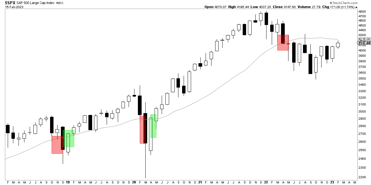 En las últimas fechas el S&P 500 cerró por debajo de la media de largo plazo en abril de 2022. En agosto de ese mismo año hubo un intento de recuperar la media, pero Jerome Powell, presidente de la Reserva Federal de los Estados Unidos, se encargó de que no fuera así tras su duro discurso desde Jackson Hole, donde claramente buscaba castigar el movimiento alcista porque no le interesaba alimentar las presiones inflacionarias en aquella fecha.
