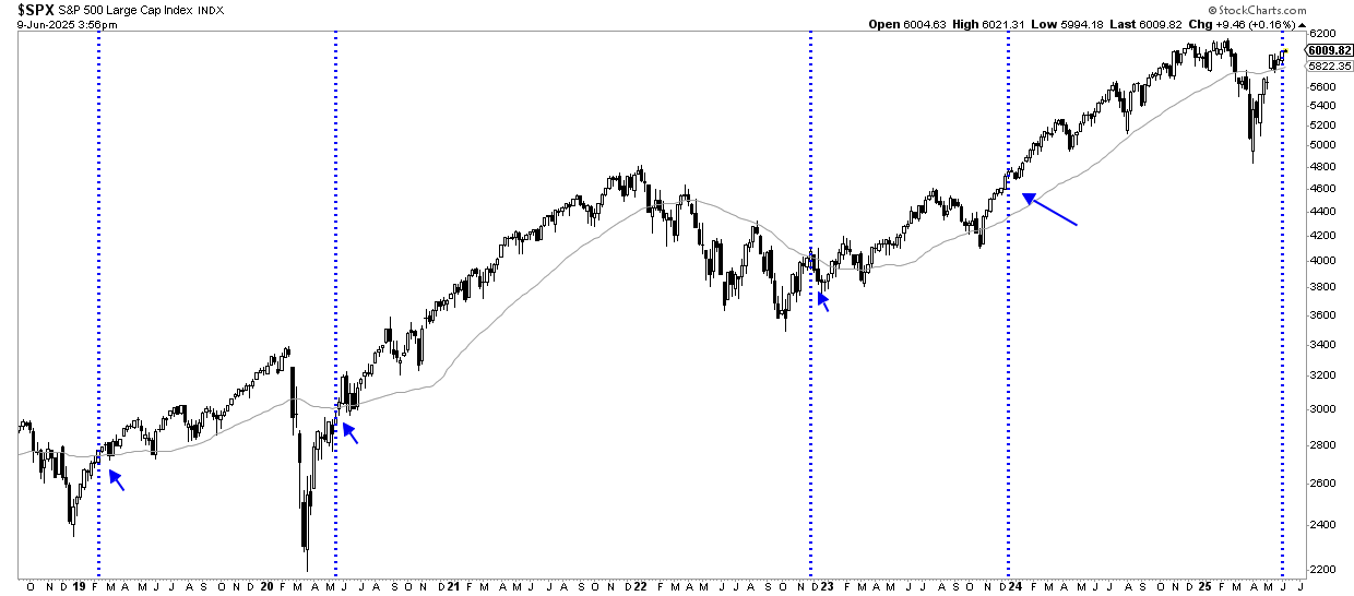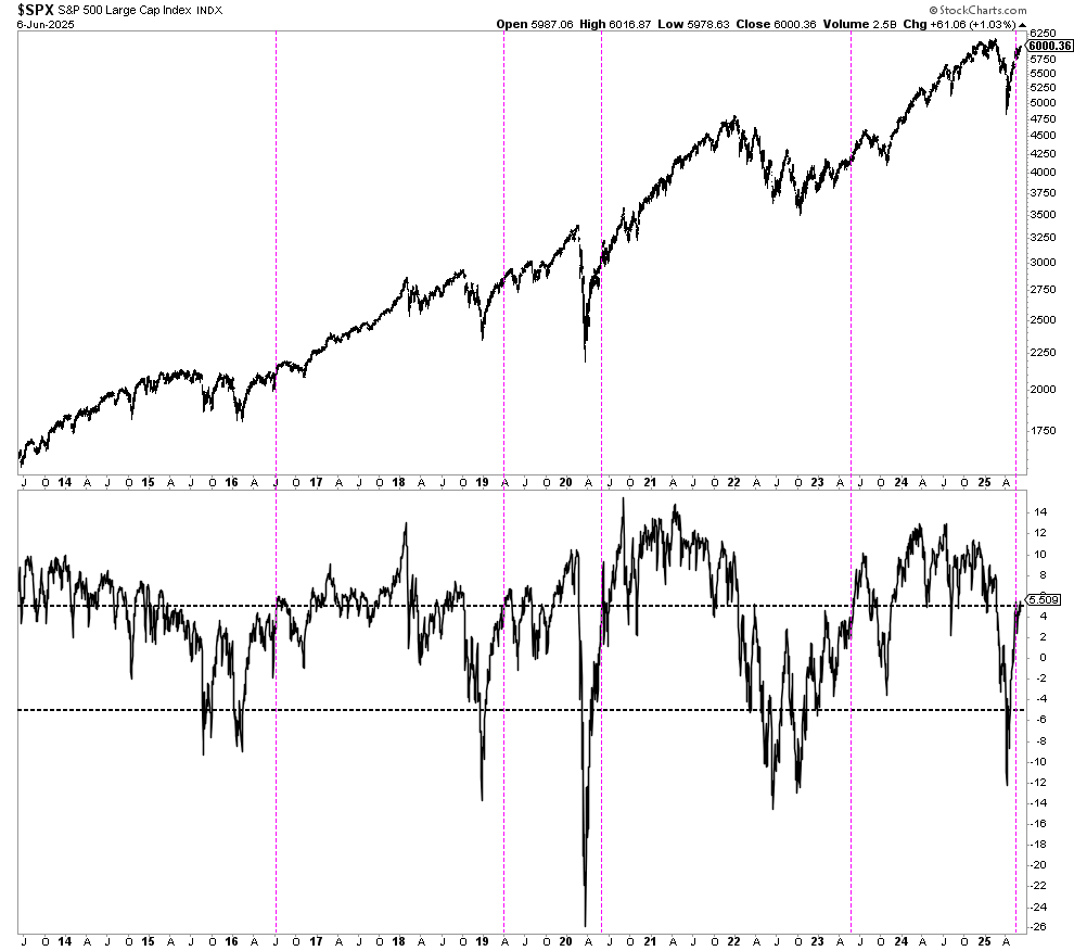 Este indicador, muy sencillo y que refleja "explosiones de momentum" del mercado de acciones, se activa cuando el mercado pasa de cotizar al menos un -5% por debajo de su media de 200 sesiones a cotizar un +5% por encima de esa misma media. Es decir, es un indicador que refleja un cambio sustancial de la naturaleza del mercado, desde sobrevendido a sobrecomprado. Y para un seguidor de tendencias, sobrecomprado no es un término negativo, sino todo lo contrario, francamente positivo.