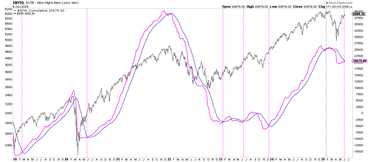 Así, otro indicador de amplitud que hemos visto innumerables veces aquí en el Club, por fin generó una señal alcista al cierre del pasado viernes, cuando el acumulado neto de nuevos máximos menos nuevos mínimos de las acciones listadas en la bolsa de Nueva York, superó su propia media de 50 sesiones, algo propio de las fases alcistas del mercado de acciones.