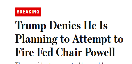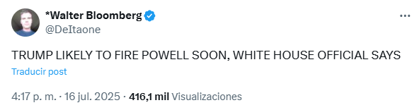 Estoy comentado todo esto porque hoy, 16 de julio, ha vuelto a salir un titular, esta vez supuestamente de "un funcionario de la Casa Blanca", donde se decía que Trump estaba considerando despedir a Powell y que incluso tendría ya listo un borrador con la "carta de despido".