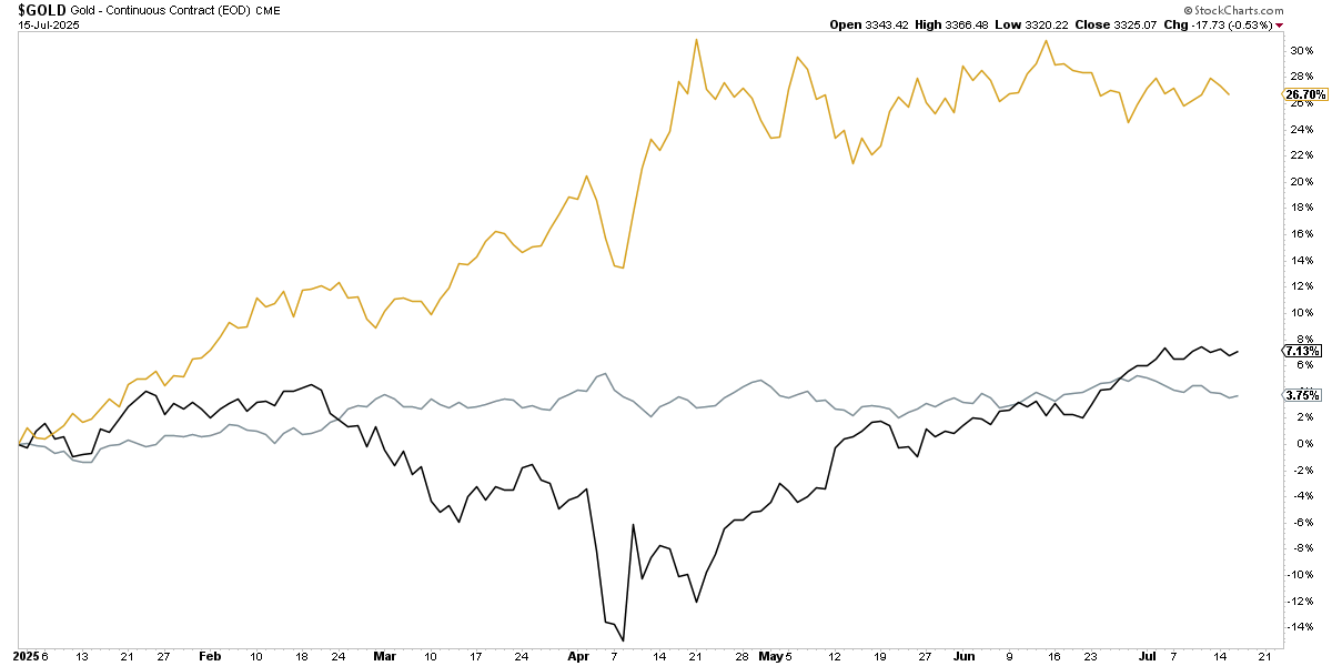 Ya siguiendo con la idea de que Trump despidiera a Powell, algo que, de nuevo, considero improbable, si llegara hasta ese punto provocaría el colapso de la deuda soberana de Estados Unidos, por extensión también provocaría una fuerte caída de las bolsas y, por último, provocaría un fuerte repunte del Oro, tanto denominado en dólares como en términos absolutos contra todas las divisas del planeta.