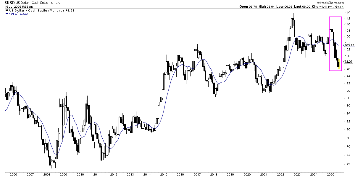 Así que la primera conclusión, si es que estoy en lo cierto con que Trump no busca despedir a Powell pero sí que le interesa que haya rumores al respecto, es que es parte de una estrategia bajista sobre el dólar estadounidense, tanto por motivos económicos internos como externos.